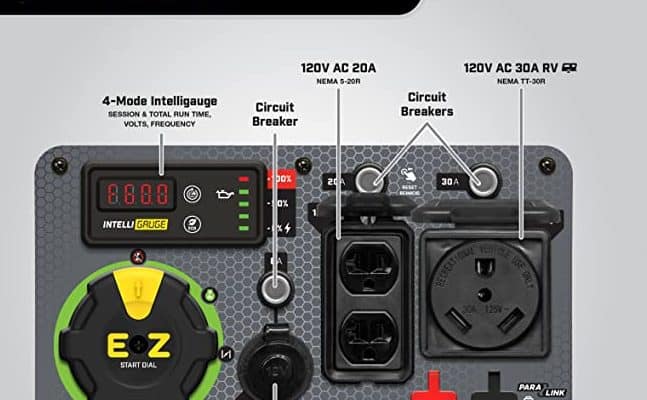 The Intelli gauge on the front of the control panel provides you with four essential modes of operation. Firstly, the output mode informs you about the power output being generated by the generator, giving you real-time feedback on its performance. This allows you to ensure that the generator is supplying the necessary power for your specific needs, whether you’re running essential appliances during a camping trip or providing backup power for your RV.